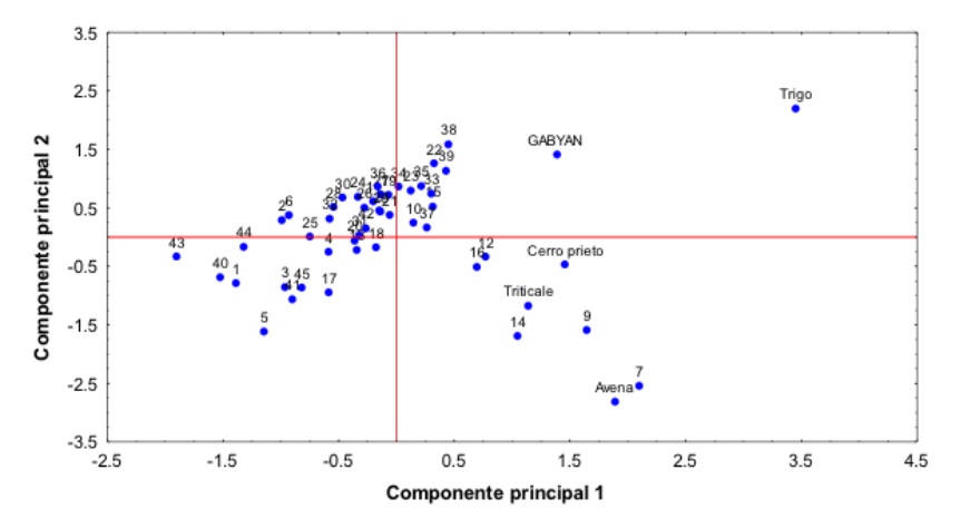 In Figure 2, the genotypes are visualized in the plane generated by the first two CP, where in the first quadrant genotypes 1, 6, 19, 29, 32 and 33, among others, have the highest yield of dry forage, height of plant and temperature, genotypes 25, 37, 44, 41, 42, 43 and 45 were located in the second quadrant, being considered the earliest. In the third quadrant, genotypes 7, 14 and the triticale and oats controls were located, presenting the highest CCI; while oats and genotypes 7 and 14 were located near the next quadrant with high CCI and NDVI values. In the fourth quadrant were Cerro Prieto, GABYAN95 and wheat, as well as genotypes 11, 12, 13, 16 among others, having the highest values of NDVI, but less yielding and late at 75 dds.