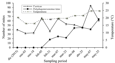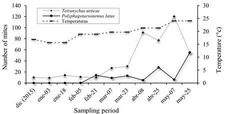 For the open field system at Agricola Los Reyes (Figure 3), a total of 839 mites were collected, of which 583 correspond to T. urticae and 256 to P. latus. The highest populations of T. urticae occurred in May, coinciding with the temperature increases; this species prefers the middle and upper strata of the plant.