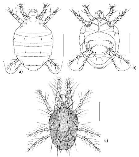 Figure 6 a) Dorsal view of Polyphagotarsonemus latus male. b) ventral view of female P. latus; and c) dorsal view of male Tetranichus urticae.