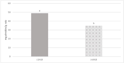 As observed in Figure 5, the roots of trees infected with HLB show significant statistical differences with healthy roots in starch concentration. With a decrease of 40%. Lemon Colimex shows a decrease in the concentration of starch in tree roots with HLB. Because they suffer from a nutritional disorder due to the interruption of photosynthesis transport from root outbreaks (Zhang et al., 2011). Causing a decrease in starch reserves in the roots of trees infected with CLas. This also causes them not to develop and suppress the growth of new roots (Etxeberria et al., 2009).