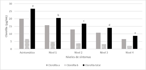 The concentration of chlorophyll in Mexican lemon leaves with different degrees of HLB involvement was determined (Figure 1). Five stages of disease development in mature leaves were chosen and chlorophyll a, chlorophyll b and total chlorophyll were quantified according to (Warren, 2008).