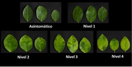 The levels of involvement from asymptomatic leaves to level 4 of HLB symptoms showed significant statistical differences with regard to the total chlorophyll concentration as shown in Figure 6. Due to the progressive accumulation of starches that cause the disintegration of the chloroplast thylakoid system (Etxeberria et al., 2009; González et al., 2011) and damages photosynthetic membranes by decreasing the concentration of chlorophyll (Sagaram and Burns, 2009). Although, the starch inside the chloroplast does not break the outer membranes, but the structure of the internal grana is destroyed which causes chlorosis (Achor et al., 2010).