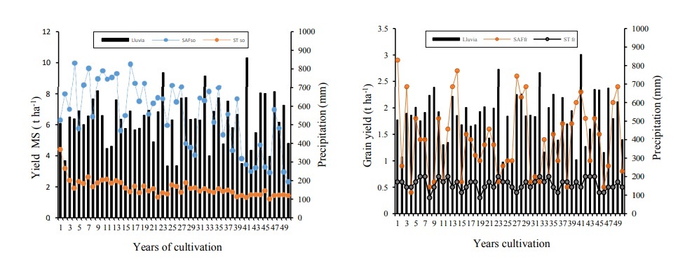 In relation to the IPP, Table 2 shows that ST with sorghum has the highest slope of the IEP curve of the two agrosystems considered, this is an indicator that this production system has a yield loss of 0.54. t of dry matter in 100 years of continuous cultivation that equals a loss of 100% of productivity. On the other hand, the ST with beans presents a relatively low IPP, with this system, the beans lose 0.1 t of grain in 100 years, which is equivalent to a loss of productivity of 20%. Finally, the SAF presented a very low IPP, the sorghum-bean rotation loses a negligible amount of its productivity. Therefore, the results obtained for the SAF with this crop rotation exhibit a greater stability in yields and lower productivity reduction in drought conditions, unlike monocultures.