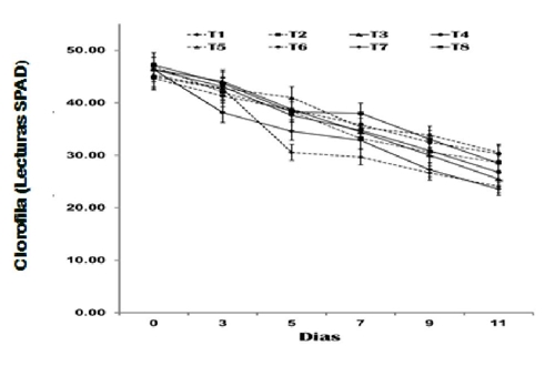 From the third day, the SPAD units of T7 decreased significantly, while in T1 they decreased from the fifth day, these two treatments being the ones that presented the least amount of SPAD units at the end of the experiment. In the other treatments the SPAD values remained constant until day 11 (Figure 5). The T8 had the same effect in terms of chlorophyll degradation between days 3 and 7, while the rest of the treatments evaluated showed significant differences on both days of evaluation. Until day seven, T8 better preserved this pigment.