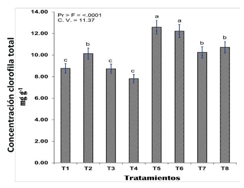 The treatments did not show the same effect on total chlorophyll in Alstroemeria plant tissue at the end of the experiment (Pr> F< 0.05). The treatments T5 and T6 with values higher than 12 mg g-1 were those that presented the highest levels of total chlorophyll (Figure 6). This situation was similar to what was observed with SPAD.