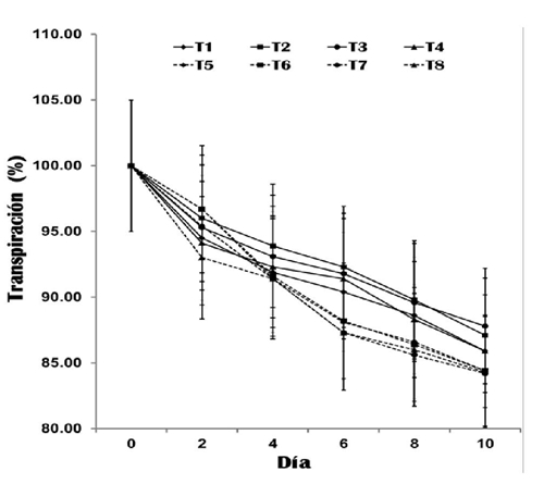 Figure 7 Percentage of loss of perspiration in cv Olga during 10 days of evaluation. Storage treatments (T) were T1 = Ca(NO3)2 1 g L-1 + tap water (control); T2 = Ca(NO3)2 1 g L-1 + Chrysal clear®; T3 = Ca(NO3)2 1 g L-1 +30% nutritional solution; T4 = Ca(NO3)2 1 g L-1 + 20% nutritional solution; T5 = Ca(NO3)2 2 g L-1 + tap water (control); T6 = Ca(NO3)2 2 g L-1 +Chrysal clear®; T7 = Ca(NO3)2 2 g L-1 +30% nutrient solution; T8 = Ca(NO3)2 2 g L-1 + 20% nutritional solution.