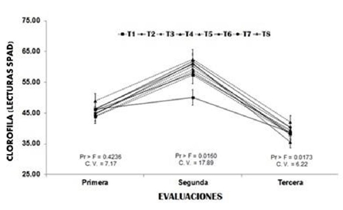 In Figure 1, it is observed that from the second and third evaluation the treatments did not have the same effect on the response variable (Pr> F< 0.05), there was a notable difference in the SPAD units of T1 and the other treatments; since these presented an exponential increase in SPAD units, while the T1 values remained constant with respect to the first evaluation.