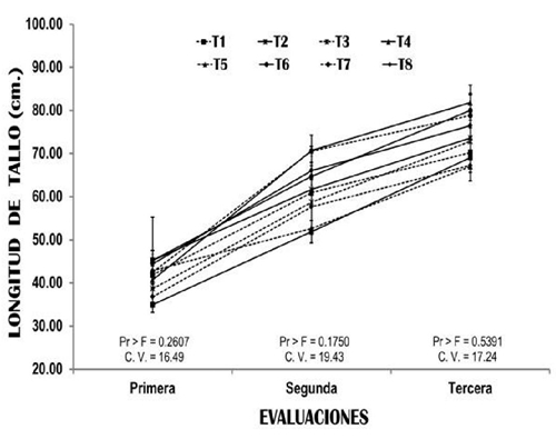 The treatments did not show the same effect on the response variable (Pr> F< 0.05). In the first evaluation, the best treatments were T4, T6 and T8, which had a stem diameter of 0.57, 0.57 and 0.55 cm, respectively. These treatments exhibited differences with respect to T5, T3 and T1 themselves that had a diameter of 0.47, 0.47 and 0.45 cm (Figure 2). In the second evaluation, T4 was the one with the largest stem diameter (0.64 cm), this treatment was different from T7, T2, T1, T5 and T3, which presented values from 0.52 to 0.56 cm. In the third evaluation, the treatments that presented the smallest stem diameter were T1, T2 and T5, highlighting that the best treatment was T4, which exhibited a stem diameter of 0.64 cm.
