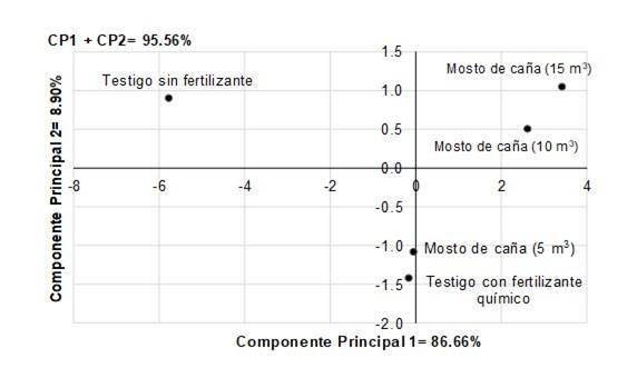 In the abscissa axis (CP1) it was observed that the treatment that gave rise to the highest yield was the application of the highest dose of sugar cane must, which presented the highest values in all the parameters evaluated. Regarding the ordinate axis, it was observed that the lowest parameters were obtained in the absolute control, without the application of fertilizers.