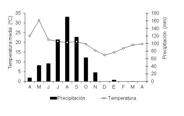 The study was carried out in the municipality of Ciudad Manuel Doblado, Guanajuato, on the ‘El Guayabo’ ranch, in the community of Santa Rita (Figure 1). It is located at coordinates 20º 43 ’49” north latitude and 101º 57 ’12” west longitude, at an altitude of 1 725 m. The annual average temperature is 20.5 ºC, with a maximum temperature of 38.5 and a minimum of 2.6 ºC. The average pluvial precipitation is 787 mm (Figure 3). The type of climate is semi-warm (A) C (wo) (w) to (e) g with annual temperature between 18 and 22 ºC with warm summer, the warmest of the subhumid with rainfall in summer, with minimal winter precipitation (<5%); extreme, that is, the difference between the coldest and the hottest month is between 7 and 14 ºC and the march of the same is Ganges type (García, 1987).
