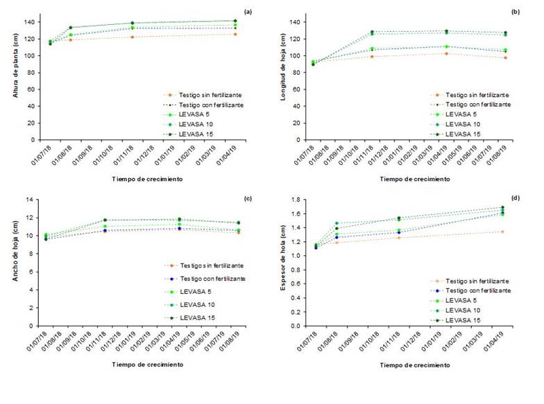Five treatments were evaluated: (1) control without application of fertilizers, (2) control with application of 300-160-700 kg ha-1 of N-P2O5-K2O, (3) application of 5 m3 ha-1 of Levasa, (4) application of 10 m3 ha-1 of Levasa and (5) application of 15 m3 ha-1 of Levasa. The treatments were established in beds with three rows of plants (9 m wide) by 72 m long; that is, about 648 m2 of surface per repetition or block. The distance between plants was 1 m. The basic experimental unit included three rows or rows of plants and 12 m long (36 m2), there were 36 plants per experimental unit. The four central plants of the central row (12 m2), which corresponded to the sampling unit, were considered as a useful plot. The total experimental area was 2 592 m2.