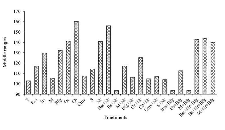 Figure 2 Biofungicide response to the incidence of H. vastatrix Berk. & Br. in seedlings of C. arabica L. var. Geisha at 150 dda. Low values of medium ranges equal a lower incidence.