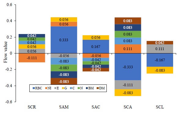 A similar condition is presented in the performance of criteria C, N and BM, only in this case all three belong to the environmental dimension and the weight of importance assigned to each is 0.0834, so that the positive contribution of each criterion is a little lower (0.042, Figure 2). The case of the RBC criterion has a zero contribution to the Net Global Flow of SCR. This is explained because its performance in this criterion (1.3, in Table 2) corresponds to the midpoint between the five systems.
