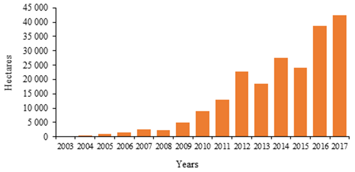 The area destined to protected agriculture increased from 132 ha in 2003 to 4 877 ha in 2009 and by 2017 it had reached 42 515 ha. Only in 2008, 2013 and 2015 was there a reduction in the area sown compared to the previous year, but the upward trend continued (Figure 2). To develop in this way, this form of agriculture had favorable market conditions, a favorable social environment and proper government management, which helped the success and expansion of this type of business of production and commercialization of food and ornamental plants.