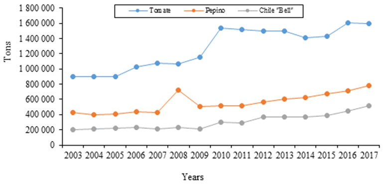 The beginning and growth of protected agriculture in the country did not occur in isolation. The demand for vegetables by the United States of America and Canada at times of the year when these countries have greater climatic difficulties to produce them explains the role of Mexico in this area, under the protection of the trade integration regulated by the North American Free Trade Agreement, signed in 1994 by the presidents of the three countries, since this type of agriculture is focused, to a large extent, on export, at least that of the big entrepreneurs of this subsector and mainly in three products: tomatoes, cucumbers and bell peppers (Figure 3), although production has been diversifying into many more products, but without reaching the importance of those that are mentioned.