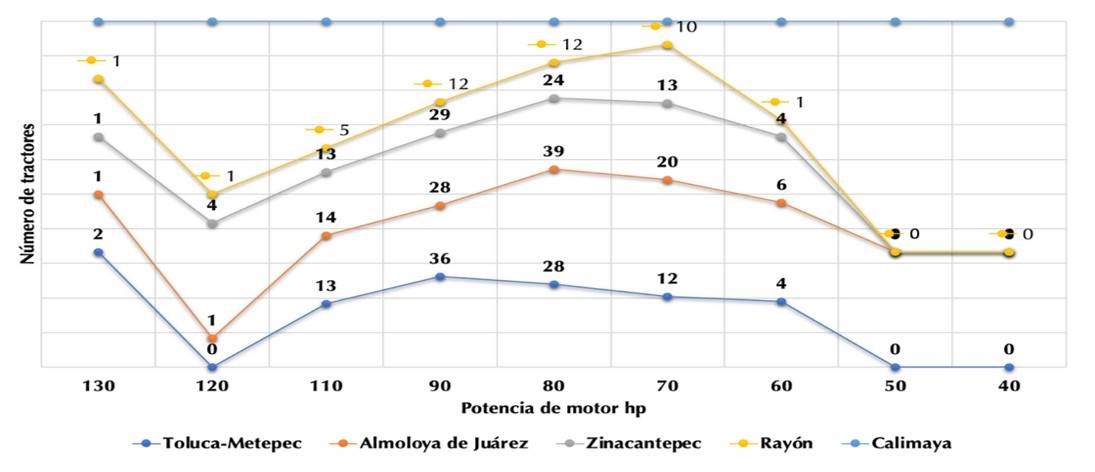 Although the municipalities of Zinacantepec and Calimaya have a large number of tractors. Given the extension of the area used in cultivation work in hectares and the number of tractors as a whole, it yields a ratio of approximately 15 ha tractor-1, a fairly small amount, taking into account that FAO proposes approximately 50 ha/tractor (FAO-FAOSTAT, 2017).