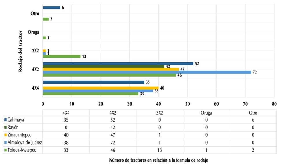 In the municipalities Toluca-Metepec, 34.7% of the tractors are of the 4 x 4 system, in Almoloya de Juárez, 34.2% is of this same system and in the municipality of Zinacantepec, it is 45.5% and, for example, in the municipality of Rayón, no tractor with this traction scheme was found and as Morelos et al. (2009) state, when comparing these two schemes, there are advantages in the tractor with a 4 x 4 traction scheme, when calculating slipping and traction forces.
