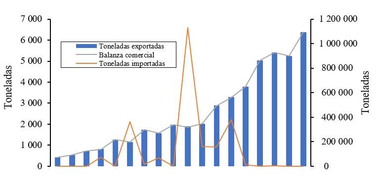 Figure 1 Behavior of exports, imports and trade balance of avocado in Mexico 2001-2018 (t). Prepared with data from TRADEMAP (2021).