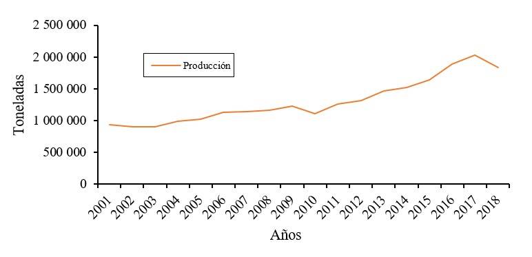 Figure 2 shows the production at the national level, which has increased, the production was 940 229 t in 2001 and 1831 538 t in 2018. The increase in production may be due to the creation of new varieties that are more efficient and resistant to pests and diseases, especially Michoacán and Morelos.