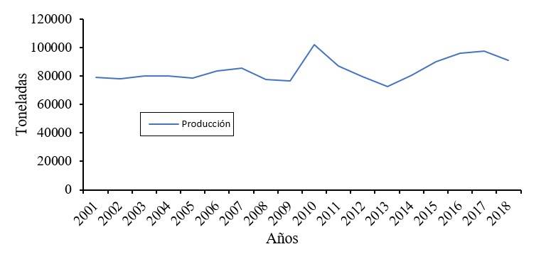 Figure 4 Behavior of avocado production in the EU from 2001-2018 (t). Prepared with data from EUROSTAT.