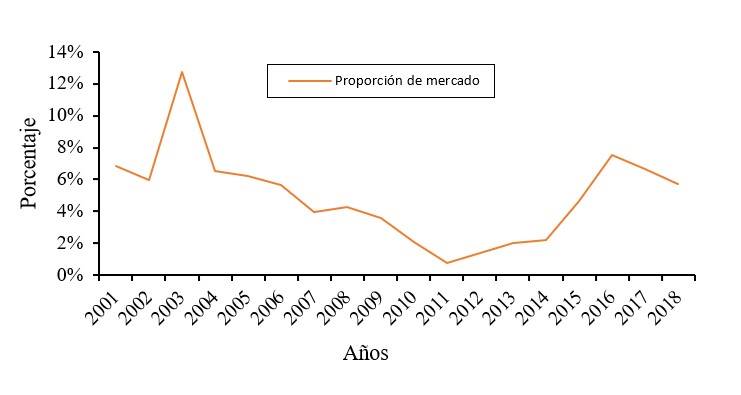 Figure 5 shows the proportion of Mexican exports in EU imports, they represented 6.9% in 2001 and 12.7% in 2003, the year with the highest proportion, in 2004 there was a fall due to the high price, it was 1462.61 dollars per ton, slightly higher than the price registered in the market.
