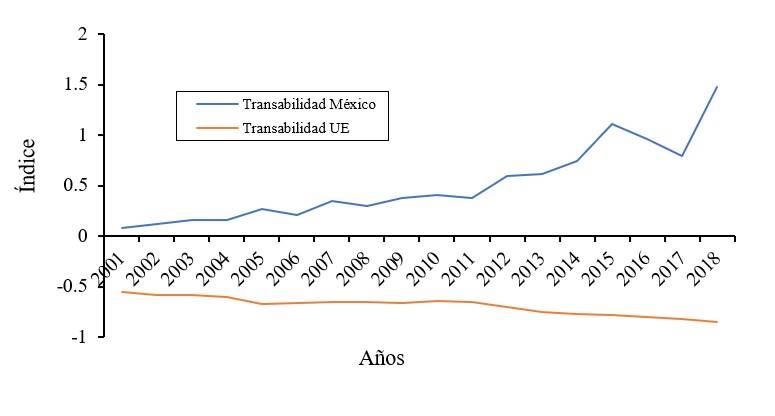 Figure 7 Tradability index of avocado for Mexico and the EU from 2001 to 2018. Prepared with data from TRADEMAP, FAOSTAT and SIAP (2021).
