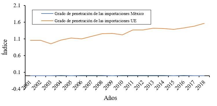 Figure 9 Index of degree of penetration of avocado imports for Mexico and the EU 2001-2018. Prepared with data from TRADEMAP, FAOSTAT and SIAP (2021).