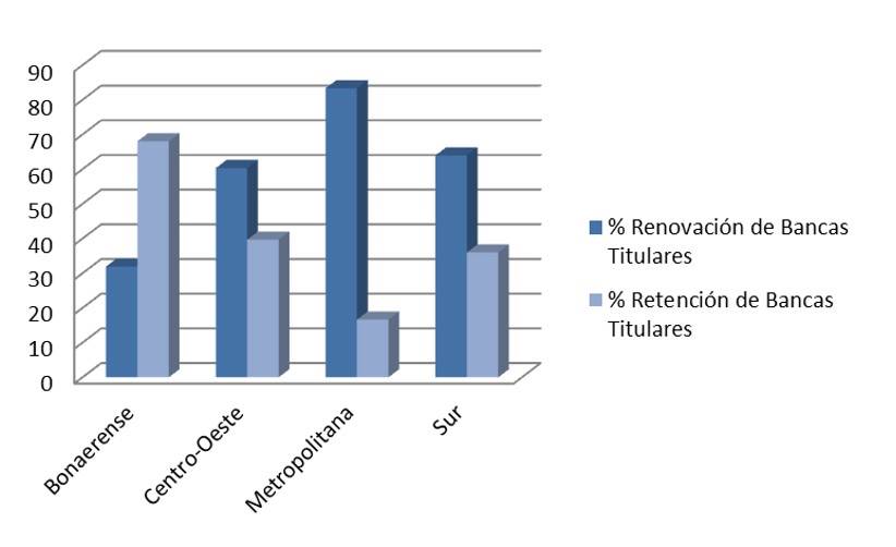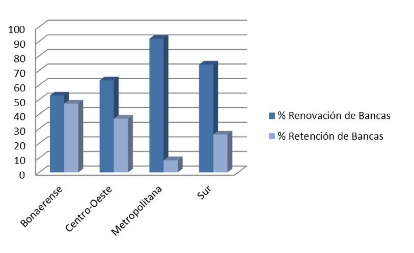 In Figure 2, it can be seen that for all the regions under study, the retention rate of seats has increased when considering only the incumbent representatives. In the particular cases of the Center-West, Metropolitan and South regions, although the difference remains in favor of the rotation rate, it decreased from 26.31% to 20.67%, 83.33% to 66.57% and from 48% to 28%, respectively for these regions. In the case of the Buenos Aires region, the re-election rate of the incumbent superior councilors is 68%.