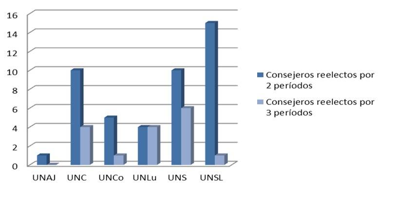 When analyzing the councilors re-elected for two consecutive terms, it is observed that, in the National University of San Luis, there have been 15 councilors who kept their seat, this institution is followed by the National Universities of Córdoba and Sur, with 10 re-elected councilors, the National University of Comahue with five, the National University of Luján with four and the National University of Arturo Jauretche, as we have mentioned before, with only one re-elected councilor.