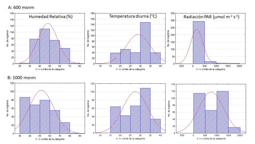 At 600 masl, more than 250 records of PAR ranged from 0 and 500 μmol m-2 s-1, while at 1 000 masl, 120 records ranged from 1 000 to 1 500 μmol m-2 s-1 ( Figure 1), lower than the values reported by Andrade and Zapata (2020) at noon in coffee plantations with low shade levels. Under these conditions, photosynthesis is more affected, as it has been shown that in C. canephora, the points of compensation and saturation of radiation fluctuate between 10.7-27.6 and 552- 660 μmol m-2 s-1, respectively (Rodríguez et al., 2012) and although in arabica coffee trees (C. arabica L.), higher light saturation values (600-700) are reported (DaMatta et al., 2007), they are still above those recorded in this research.