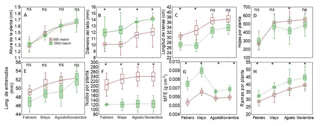 Plant height (PH) was measured from the base of the stem to the cauline apex with a tape measure (cm plant-1). The stem diameter (SD) was taken 30 cm from the base of the stem with a Lenfech Caliper digital vernier. Orthotropic internode length (IL) measurements were taken with the same equipment. Plagiotropic branch length (PBL) was measured with a tape measure. Leaves per plant (LP), branches per plant (BP) and total nodes (NP) were counted. The specific leaf mass (SLM) and the specific leaf area (SLA) were determined with ten discs of leaves from the middle part of each of the five selected plants, which were placed in a Dakton® gravity convection drying oven, at 80 °C until constant weight. The dry weight was then divided by the area of each disc to obtain the specific leaf mass (g cm-2) and vice versa for the specific leaf area (cm2 g-1).