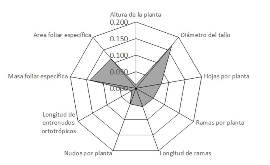 Canonical correlations between functional traits and microclimate variables at both altitudes showed a significant correlation (Table 2). At 600 masl, RH favored the growth in height of the coffee trees, as well as the emission of leaves, branches, nodes, and the accumulation of biomass per unit of leaf area (SLM), while at 1 000 masl, RH positively influenced the growth in height of the coffee trees, as well as the emission of leaves and plagiotropic branches.