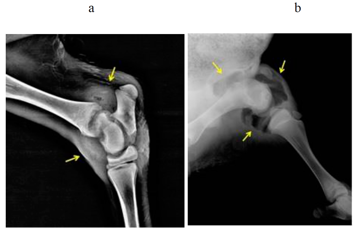Figure 1: a) Radiopacity increase in punctate radiolucent appearance around the tibiotarsal joint due to arthritis purulenta in a case with tarsitis; b) Formed radiolucent appearance due to possible microorganism activity in femoropatellar and femorotibial joints in a case with gonitis