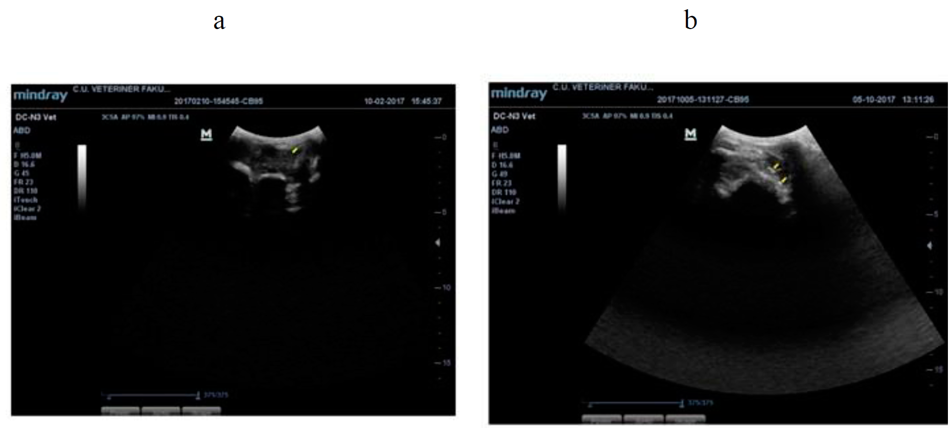 Figure 2: a) Hyperechogenic and heterogenic appearance of the synovial space in a case with arthritis, (10 d male calf); b) Complex echogenicity and heterogenic appearance of the synovial space and corpuscular spots in the synovial fluid of a case with purulent arthritis, (36 d male calf)