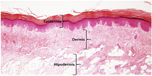 Epidermis: consists of keratinized stratified layered epithelium; Dermis: connective tissue; Hypodermis: fatty tissue. Technique: paraffin, hematoxilin-eosine24.
