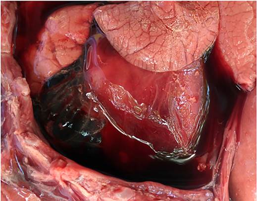 Figura 1 Caso 1, abortado por Campylobacter fetus subesp. venerealis. El epicardio está cubierto por material fibrinoso moderado a grande junto con líquido serosanguíneo