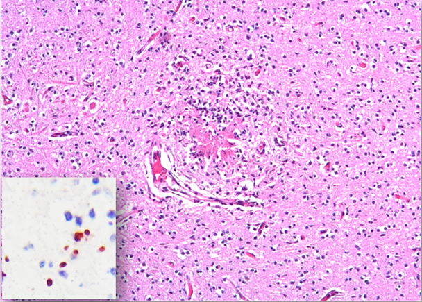 No se observaron lesiones macroscópicas significativas en los casos 2 a 5, y no se observaron lesiones microscópicas en los casos 2 a 3. Sin embargo, en los casos 4 y 5 el examen histológico reveló encefalitis necrotizante multifocal no supurativa (Figura 2), miocarditis linfocítica e histiocítica y miositis, y nefritis linfocítica intersticial. Se detectó intralesionalmente la presencia de antígeno de Neospora caninum en el cerebro de estos dos fetos mediante IHQ (Figura 2, detalle). Los títulos de los anticuerpos a N. caninum oscilaron entre 1/200 y 1/3200 en 10 de las 27 vacas examinadas. Además, la PCR del ADN para detectar N. caninum fue positiva en ambos casos. El análisis IHQ para detectar VDVB fue negativo en el hígado, corazón y pulmón en los casos 2, 4 y 5. Por último el análisis IHQ para detectar Leptospira spp. fue negativo en los riñones y el hígado de todos los fetos. No se detectaron títulos de anticuerpos contra Leptospira spp. en ninguno de los cinco fetos. Otros patógenos abortígenos como las especies de Brucella fueron descartados. Su negatividad se basó en el aislamiento negativo del patógeno y la ausencia del patógeno en asociación con las lesiones compatibles.