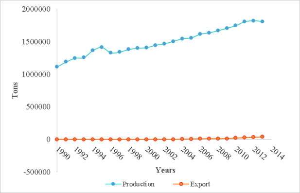 The volume of production of carcass beef in Mexico exhibits an upward trend from 1990 to 2013 (Figure 1), its growth was 62.2 %, going from 1,114 to 1,806.8 thousand tons, with a mean annual volume of 1,554.6 thousand tons6. However, the level of yield of carcass meat (204.7 kg in the 2004-2013 period) positioned the country in the 69th place in productivity.