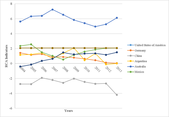 Likewise, only two countries in Latin America ―Mexico and Argentina― have been proven to have positive competitiveness levels; although in both cases the RCA exhibited a slight downward trend with marked ups and downs (Figure 2), but the rank of variation of Argentina turned out to be slightly broader than that of Mexico. The RCA for Argentina decreased by 2.1 points and its coefficient of variation (CV) was 71.6 %, while for Mexico, the RCA was approximately 2.0, and its CV was 38.1 %. In contrast, this index for the United States and Australia was characterized by its greater stability, as its variation was 1.6 points (CV= 82.5 %) and 1.4 (CV= 60.8 %), respectively.
