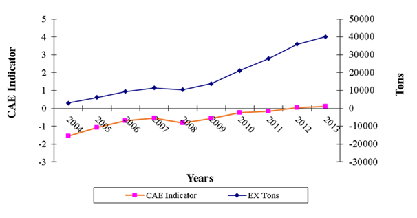 Where: CAE = revealed comparative advantage of the exports;