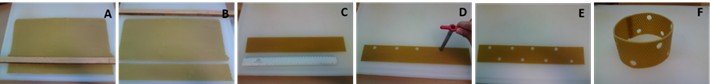 A) Measurement tracing on a stamped European honeybee Apis mellifera L. wax sheet B) Cutting of sheets. C) Size adjustment (6 x 30 cm). D) Production of ventilation holes with punch with a diameter of 1 cm. E) Finished sheet with ventilation holes. F) Cylinder for placing the newly transferred brood inside the cylinder. Source: Developed by the authors. Photo: H.R. Salazar-Vargas.