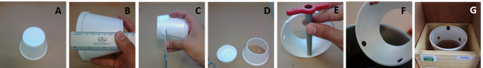 A) View of the bottom of the expandable polystyrene container B) Plotting measurements on the container. C) Cut with scissors from the lower part of the container. D) The lower part of the container is removed. E) Production of ventilation holes with punch with a diameter of 1 cm. F) Finished coating with ventilation holes. G) Transferred brood honeycombs lined with expandable polystyrene (EPSFCTBC). Source: Developed by the authors. Photo: H.R. Salazar-Vargas.