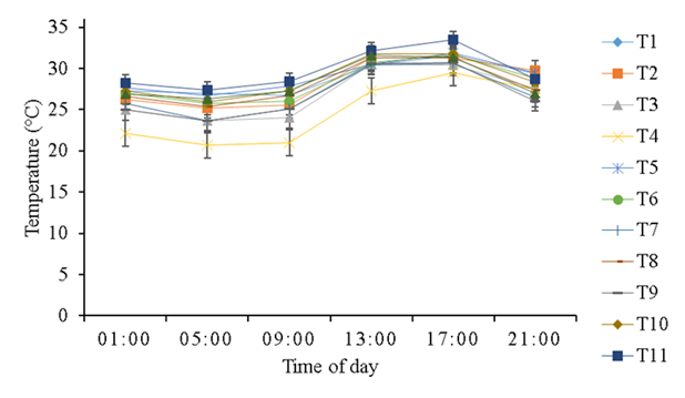 The graph of the adjusted mean NIT of the treatments over a 24 h period (Figure 3) shows similar oscillations between treatments. The highest mean oscillations correspond to T11 and T5, and the lowest, to T4.