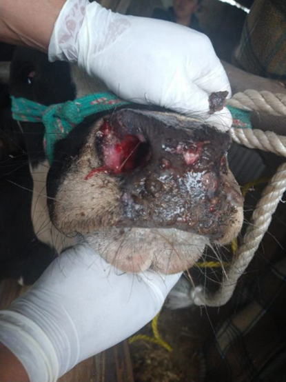 Figura 1 Toro de dos años de edad con enfermedad de las mucosas en donde se muestran lesiones erosivas en la descarga nasal, y ulcerizacíon extensiva en el hocico y las narinas