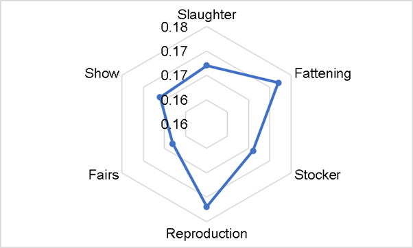 Mexico’s cattle market moved on average one third of the national inventory annually. slaughter and feedlot markets accounted for the largest proportion of livestock moved, breeding and finishing activities are carried out in the same production unit, but not for the fair, breeding and show markets (Table 1). Given that the slaughter and fattening markets accounted for the largest proportion of livestock moved, beef breeding and reproduction activities are carried out in the same production unit, unlike for the fair, reproduction, and entertainment markets.