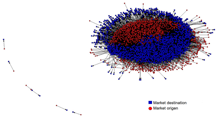 The municipal cattle movement network in Mexico was composed of 1,374 source municipalities (red points), 1,842 municipalities of destination (blue points), and 39,068 commercial links (edges). The measures of the structure of the entire network were low; the density was 0.04, and the average grade, 52.4. However, the measures of centralization were high: the degree of centralization was 0.34, for both outward centralization and inward centrality. The average network density and degree measures by market were lower than for the entire network; however, the centrality measures were higher, amounting to twice as much in the market for shows (Figure 3).