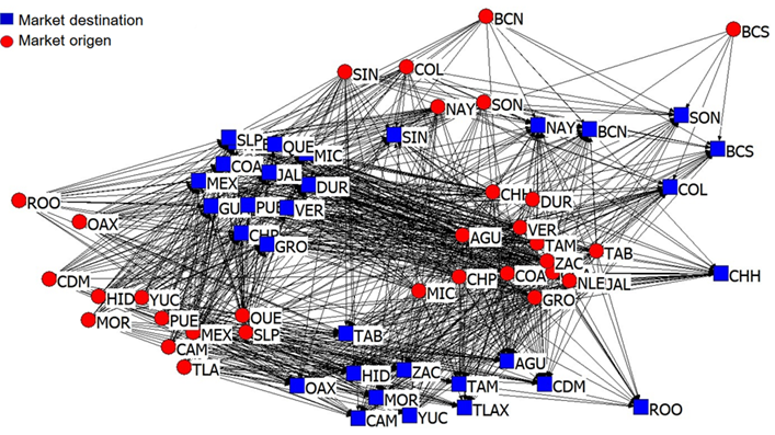 Faced with the problem of providing solutions for livestock production and distribution, the objective of the research was to analyze the structure of the livestock mobilization network in Mexico during the 2017-2021 period, through measures of economic location, centrality and density of the networks by type of market motive.