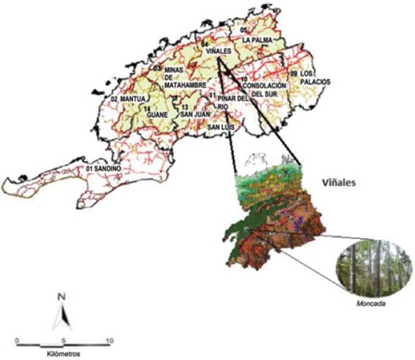 The research was carried out in a Pinus caribaea plantation in the locality of Moncada, 23 km away from the town of Viñales, on elevations where the predominant vegetation is pine, which grows on very poor, eroded soils (Figure 1).