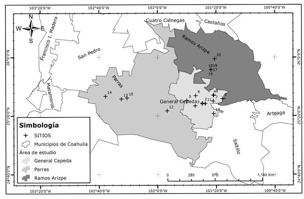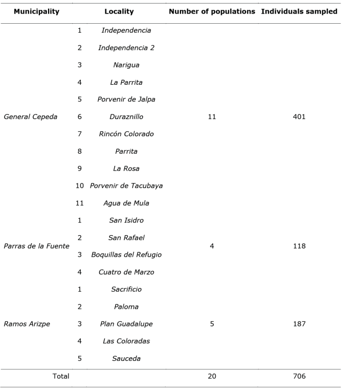The sample was composed of 706 individuals distributed in 20 populations located in three municipalities of southeastern Coahuila. The sampling was carried out during the harvesting period of the plant (July to October), and each population was georeferenced for its location (Table 1 and Figure 1).