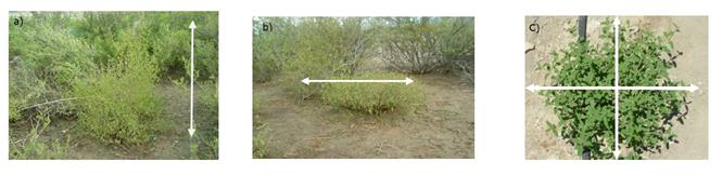 The total height (TH cm), the larger diameter (LD, cm) and smaller diameter (SD, cm) of the shrub cover were measured in each sampled individual with a Truper™ tape model 21601 (Figure 2b, c). In order to take into account the variability of the growth of the species, all the categories of height and cover of the standing shrubs present in the populations were included. The TH of the plant was measured from the base of the soil to the tip of the highest branches (Figure 2a), the LD and SD were measured taking into account the shrub cover (Figure 2b and 2c). The mean diameter (MD, cm) of the cover was estimated based on the larger and smaller diameters.